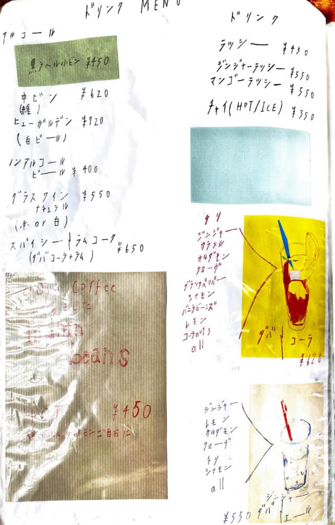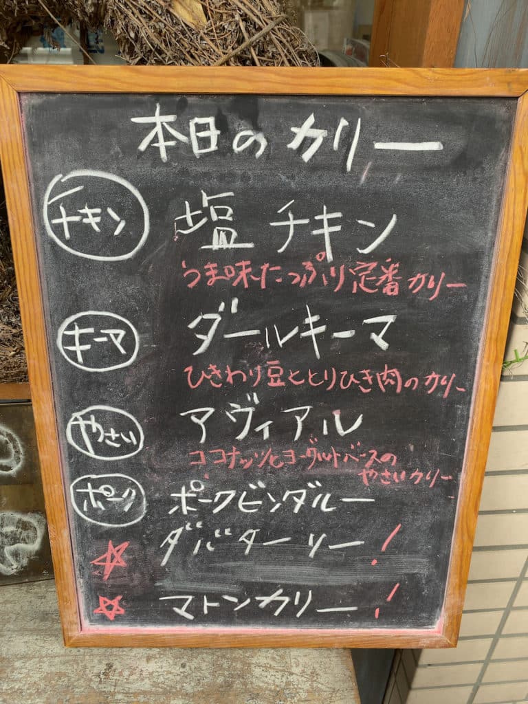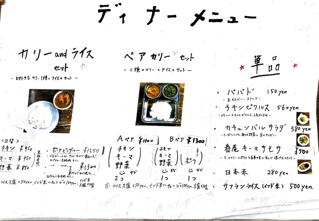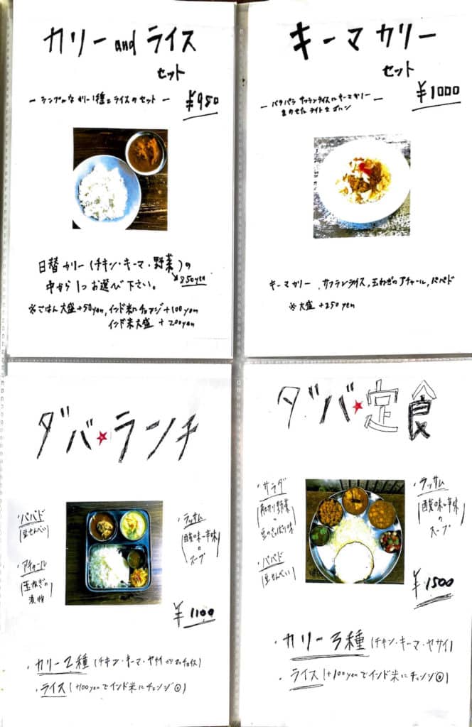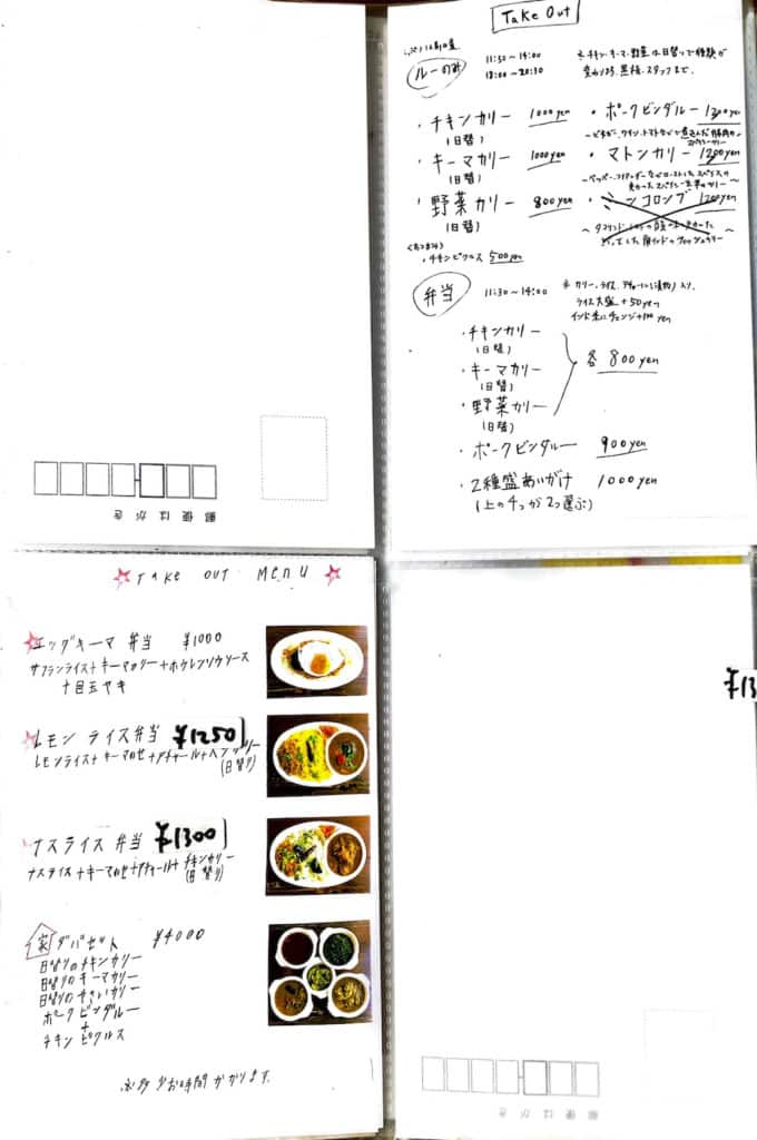 メニューの体裁が風変わりで、ハガキの裏に手書きで書かれたメニューがハガキ専用ファイルに収納されていて手作り感が満載です。ランチメニューは日替わりカリー3種をベースに、好きなカリーを組み合わせて食べるセットメニューが中心になっています。若干ですが単品もあり、テイクアウトの用意もあります。