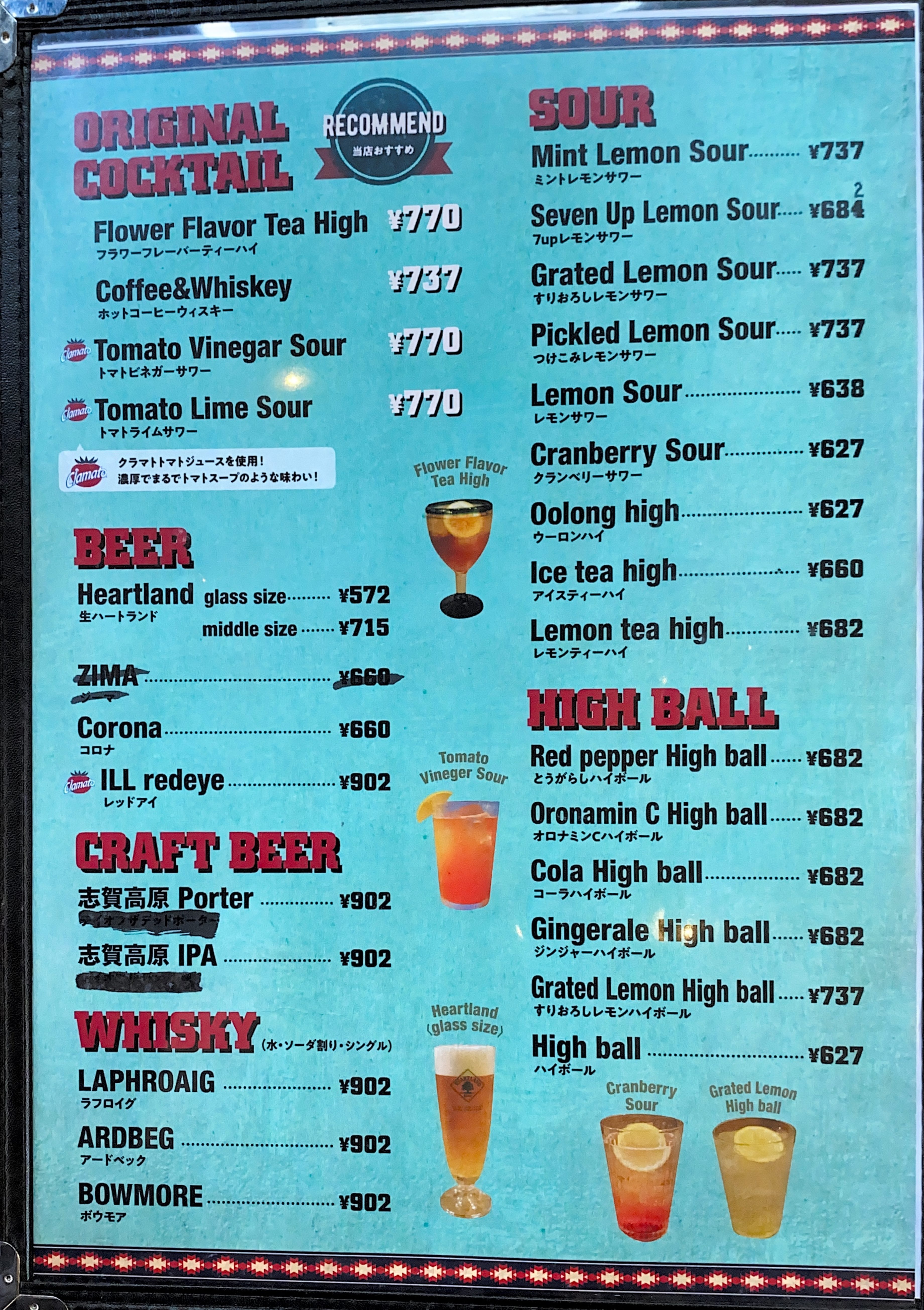 注文したドリンクは「レモンスカッシュ」(税別480円)と「セブンアップ」(税別430円)。レモンスカッシュは甘さ控えめでキレと爽快感ある味わい、セブンアップはレモンスカッシュよりもう少し甘く、無果汁ながらレモンとライムのフレーバーが魅力の味わいです。