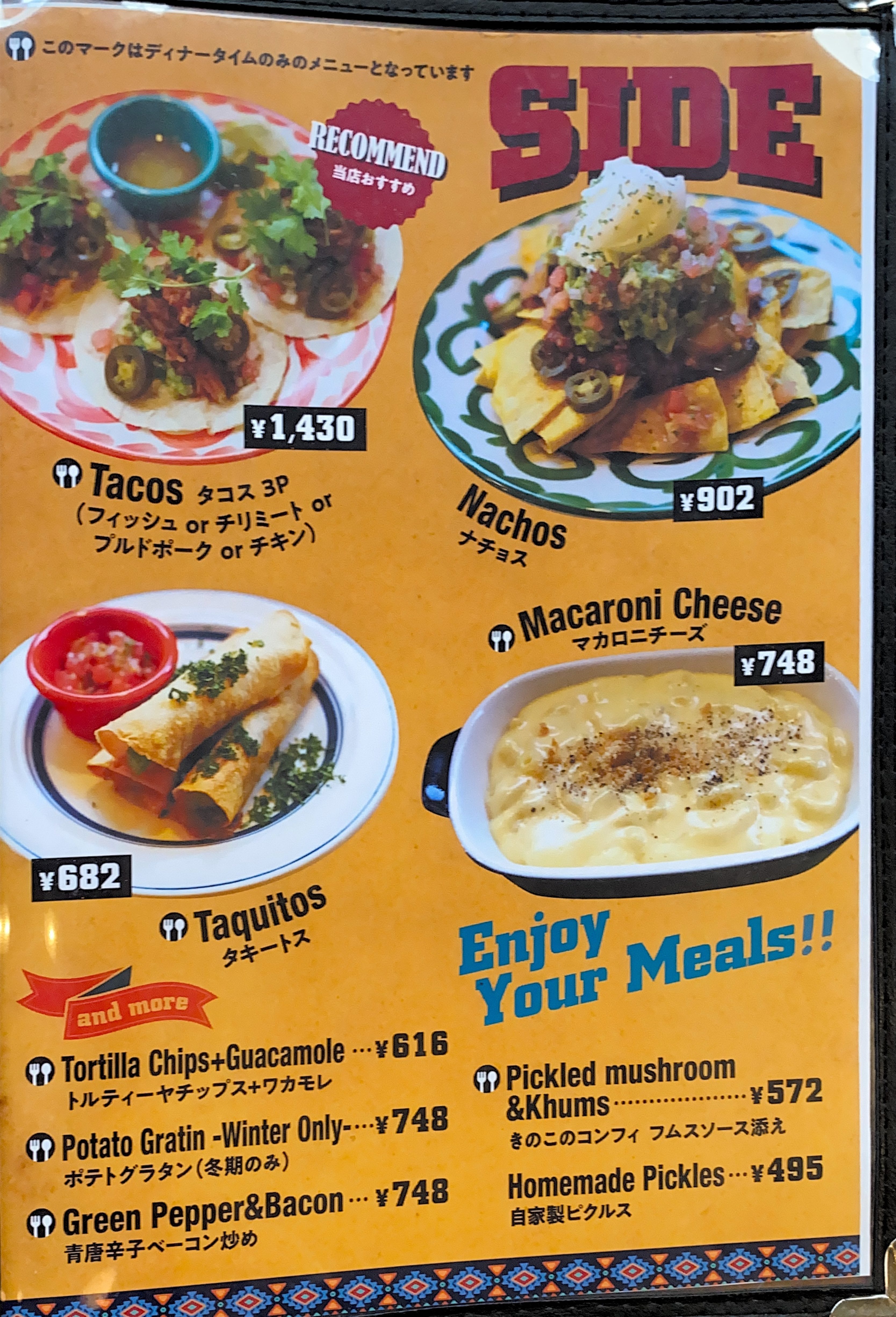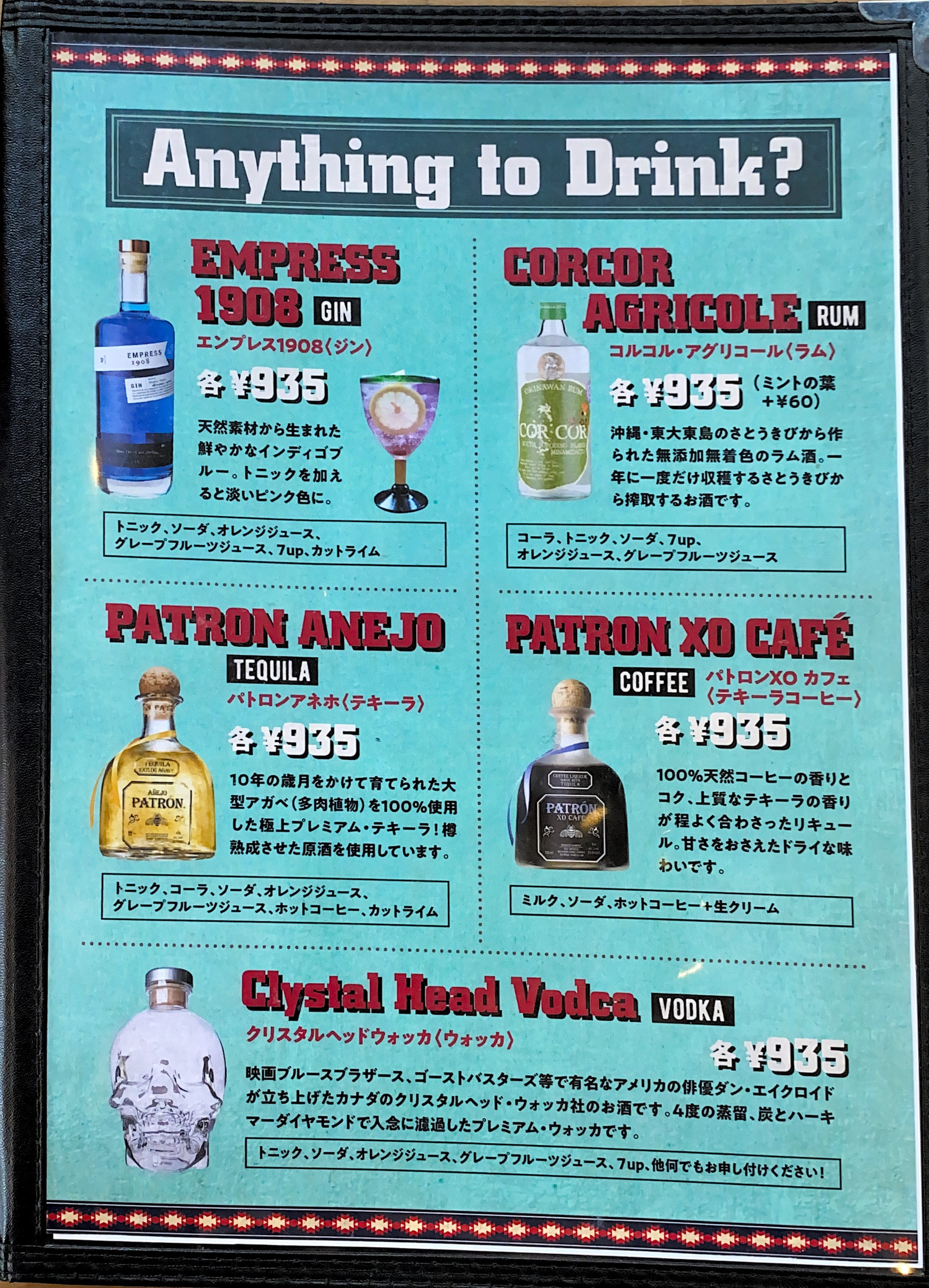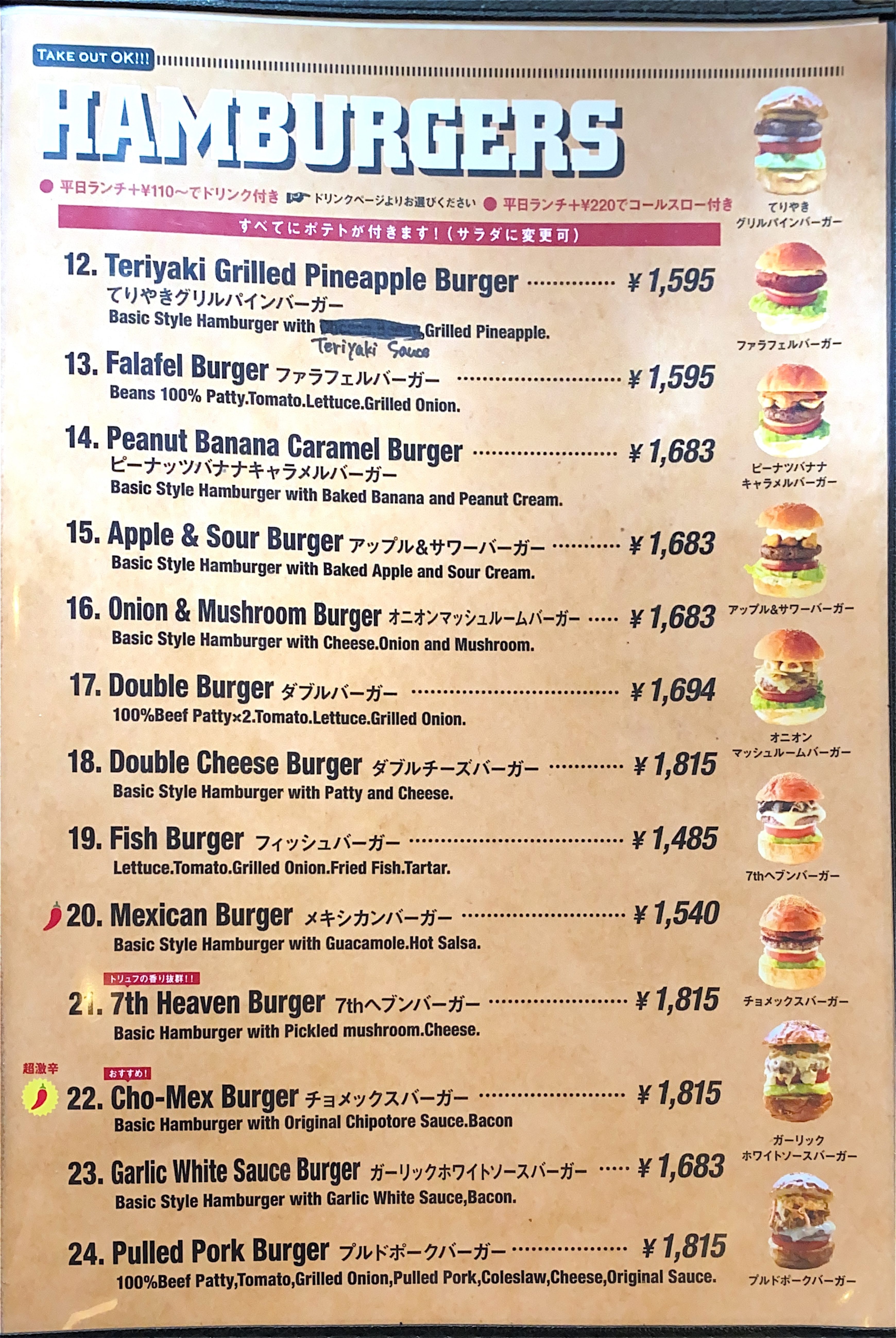 看板メニューのハンバーガーは全部で24種類もあり、サンドイッチも全部で8種類あります。他にもサラダプレートや5種類のブリトー、サイドメニューの各種フライやオニオンリング、メキシカンなタコス、ナチョスなどが用意されています。アルコール類も豊富でお酒も楽しめます。