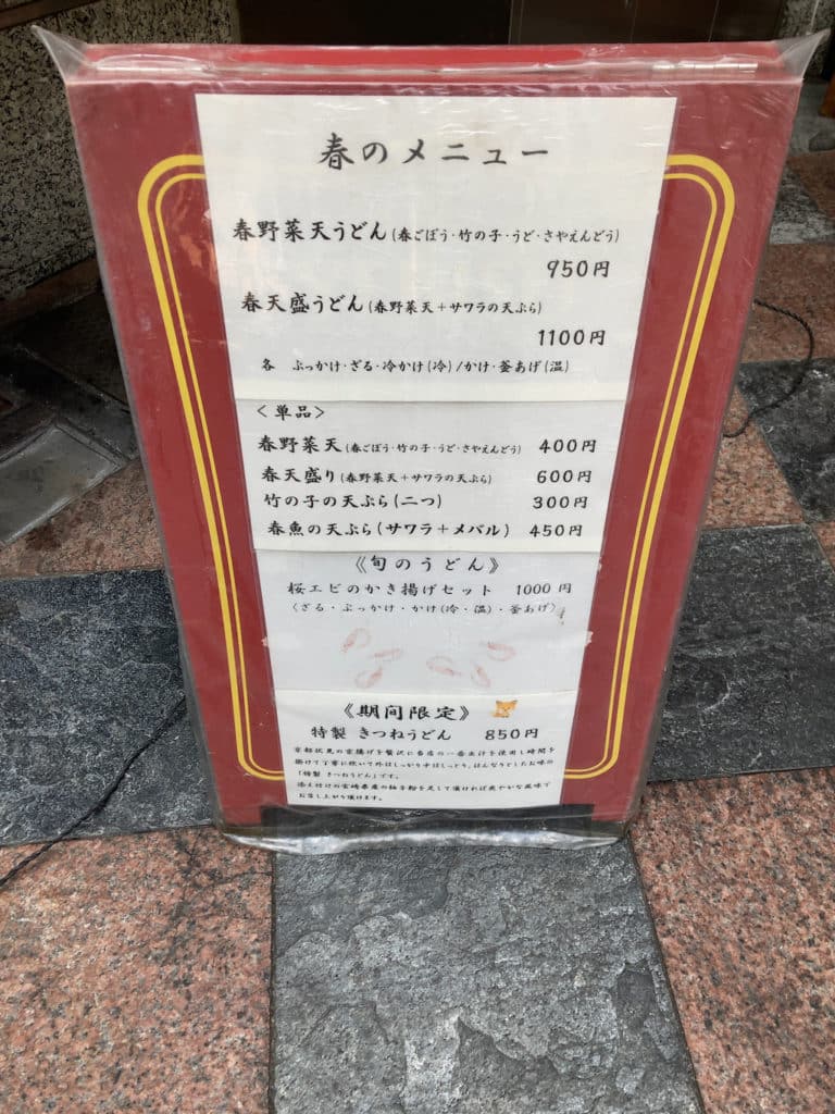 訪問時は春のメニューとして、「春野菜天うどん(春ごぼう・竹の子・ウド・さやえんどう)」(税込950円)や「春天盛うどん(春野菜天+サワラの天ぷら」(税込1,100円)、また旬のうどんとして「桜エビのかき揚げセット」(税込1,000円)などが外の立て看板に記載がありました。