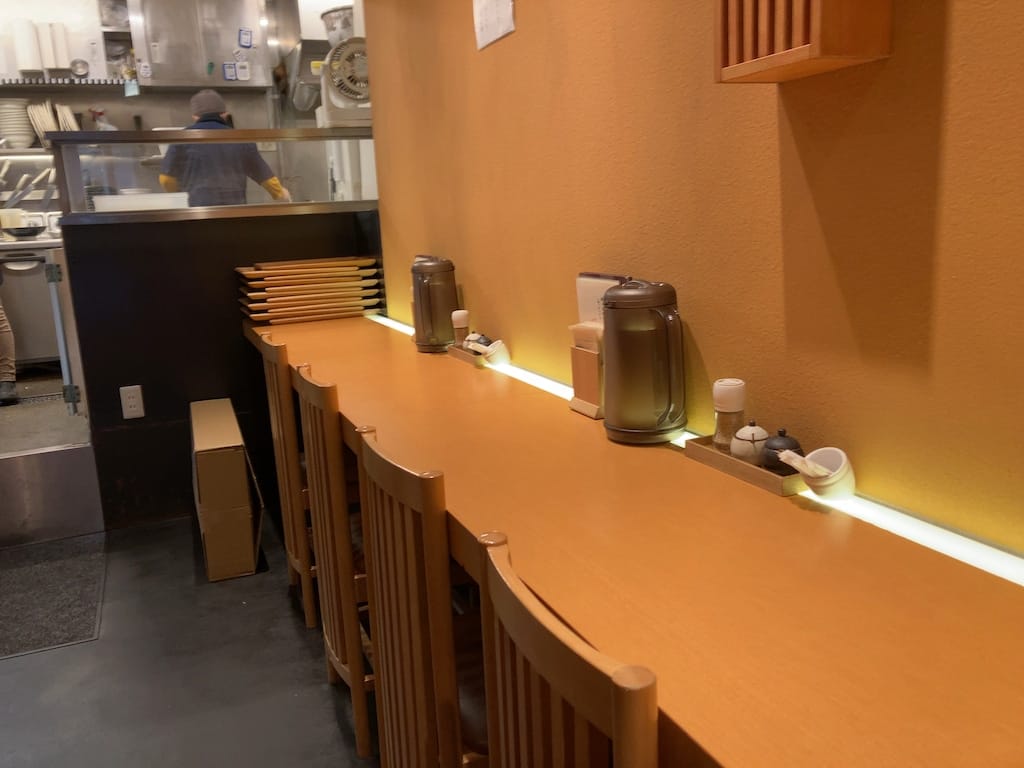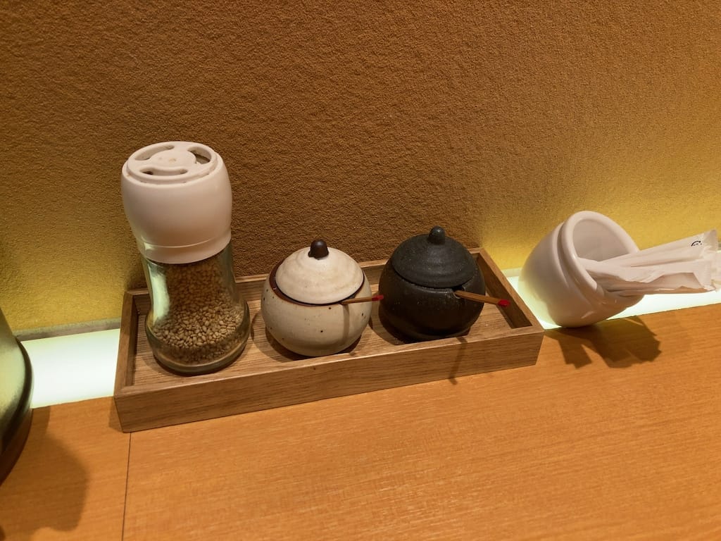 店内は入って右側にカウンター10席ほど、左側にテーブル10席ほどあり、奥に厨房があります。照明は全て間接照明で落ち着いた雰囲気です。調味料入れもオシャレで、つまようじ入れが傾いていたので直そうとしたら、そういうデザインでした(画像参照)。