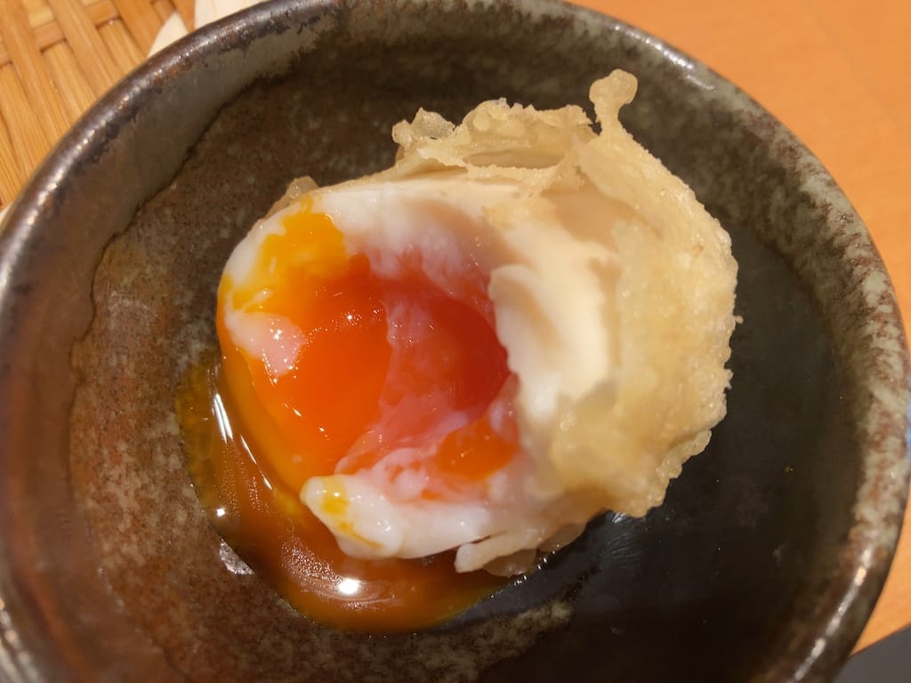 半熟たまごの天ぷらは、箸で割るとサクサクの衣の中から、熱々のトロッとした黄身が滴り落ちてきます。黄身は甘味が強く濃厚です。衣のサクサクした食感、白身のプリプリした食感、黄身のトロッとした食感が、うどんの噛みごたえと相まって楽しませてくれます。