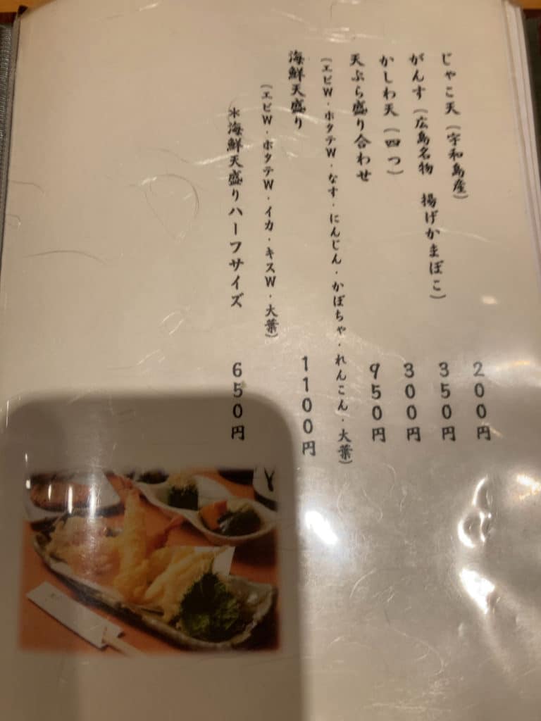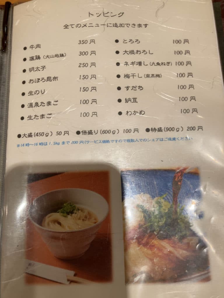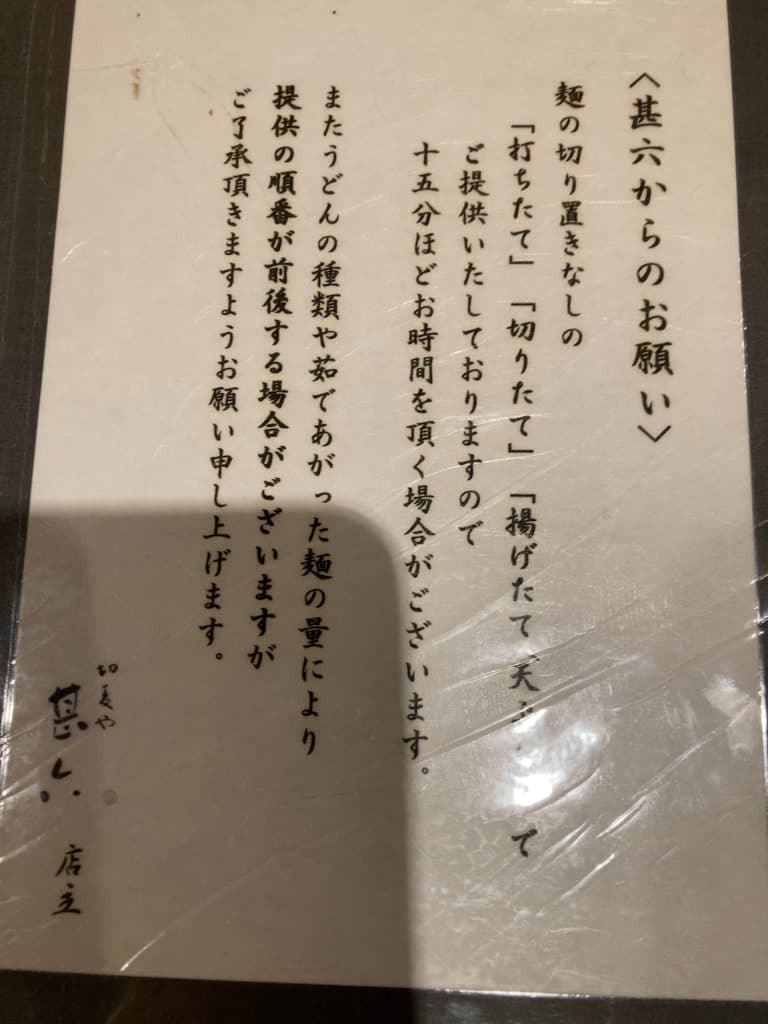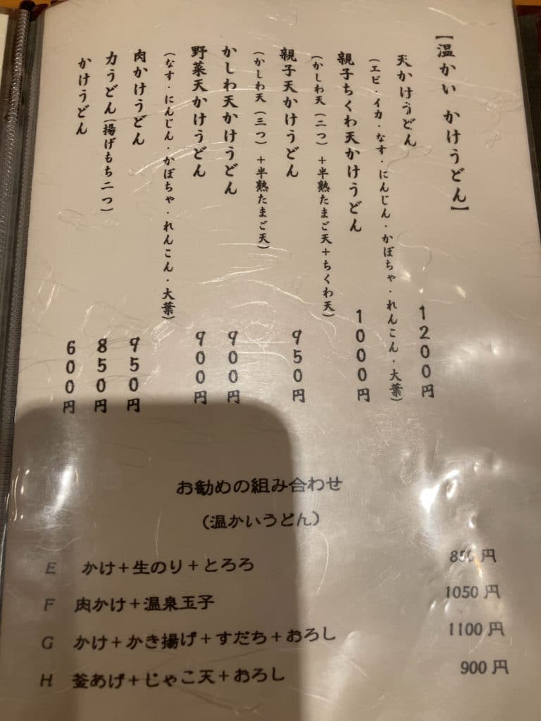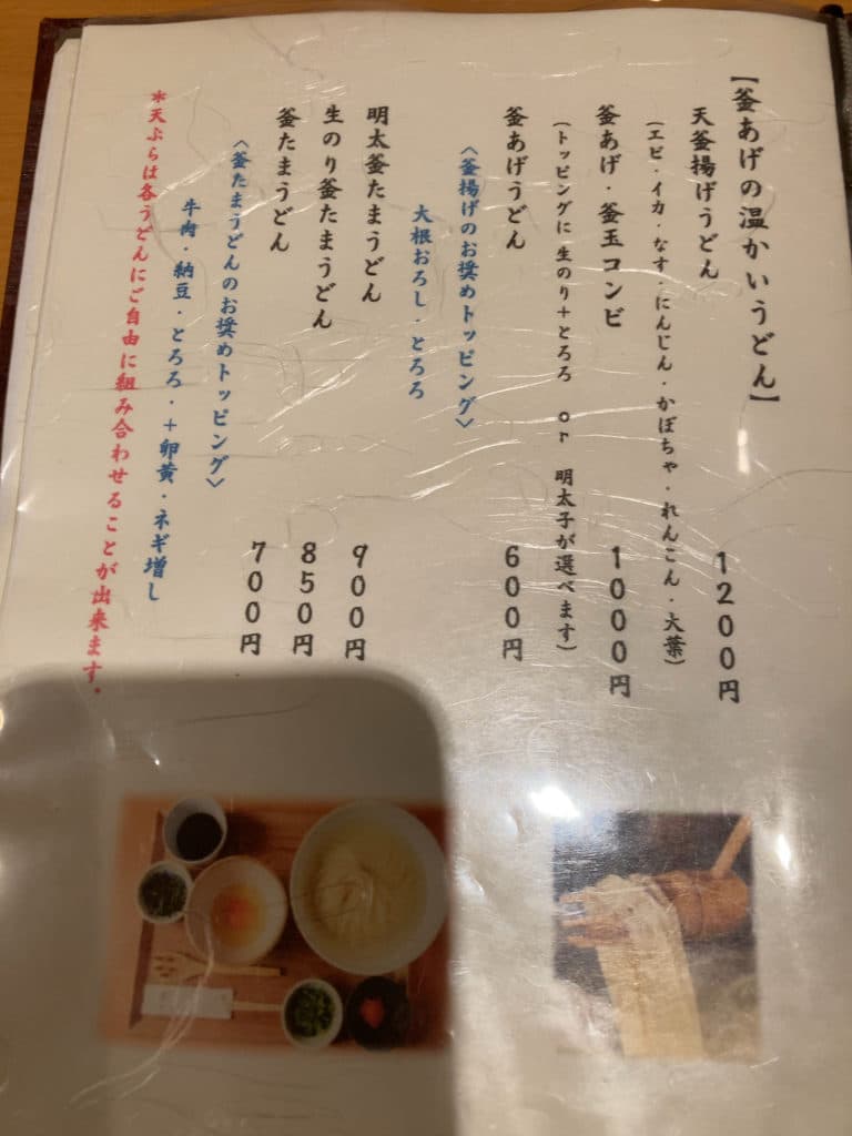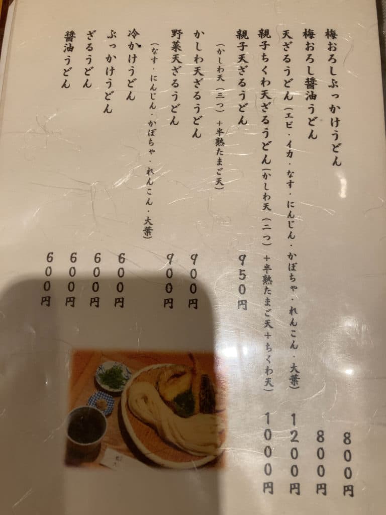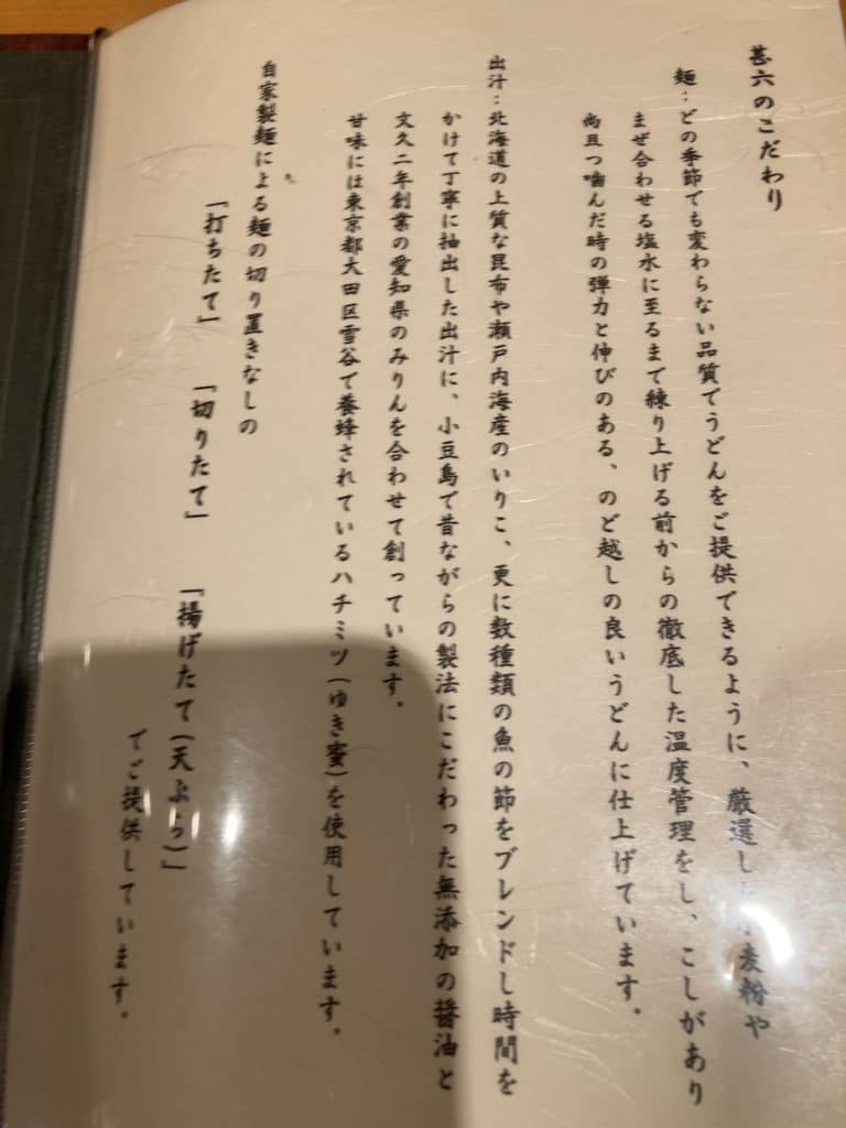 メニューは全部で18ページほどあり、何の義務感か分かりませんが全て撮影しました。うどんはもちろんのこと、それ以外にも天ぷらやおつまみも充実しています。日本酒も数多く揃っているため、気になる方はお店の人に聞いてみるといいでしょう。