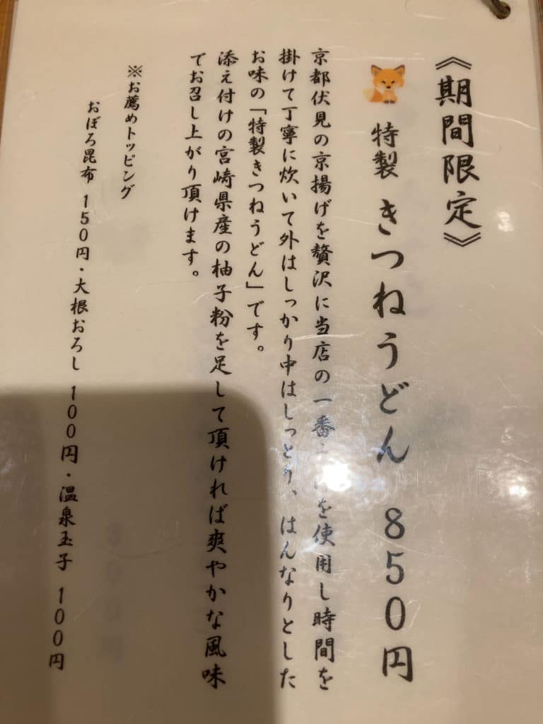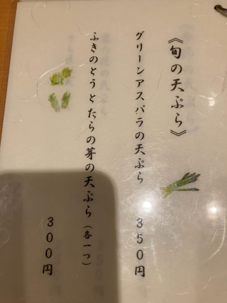 訪問時は春のメニューとして、「春野菜天うどん(春ごぼう・竹の子・ウド・さやえんどう)」(税込950円)や「春天盛うどん(春野菜天+サワラの天ぷら」(税込1,100円)、また旬のうどんとして「桜エビのかき揚げセット」(税込1,000円)などが外の立て看板に記載がありました。