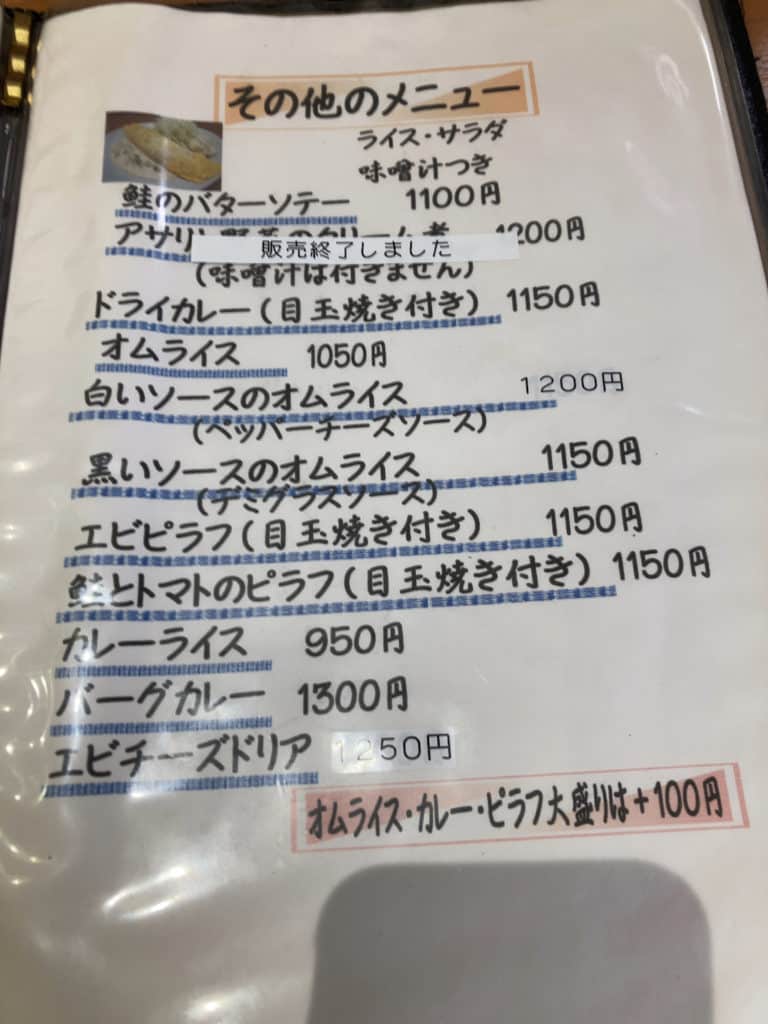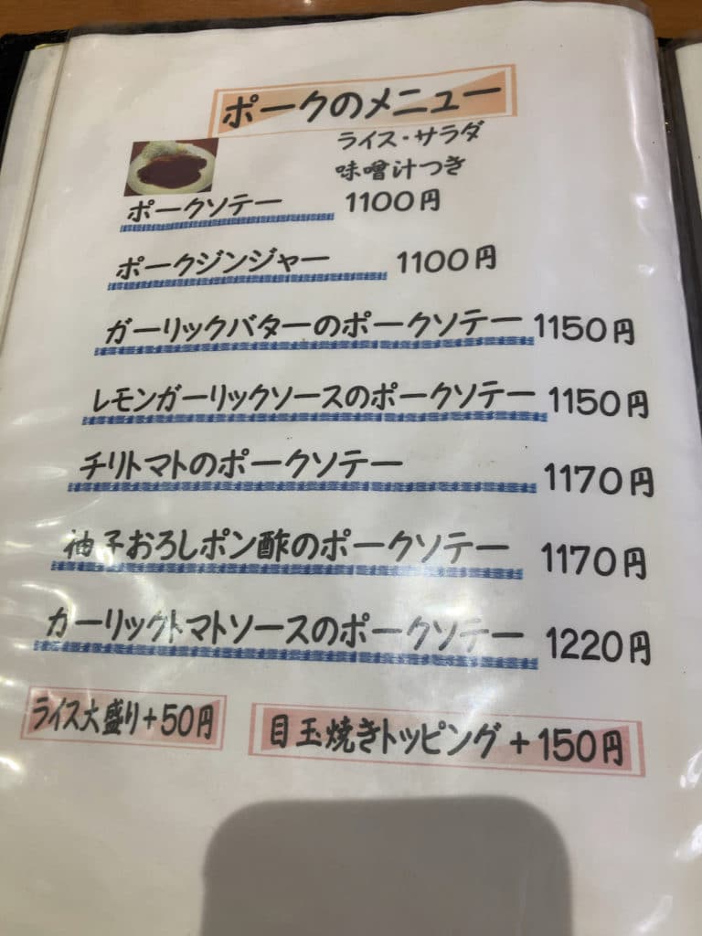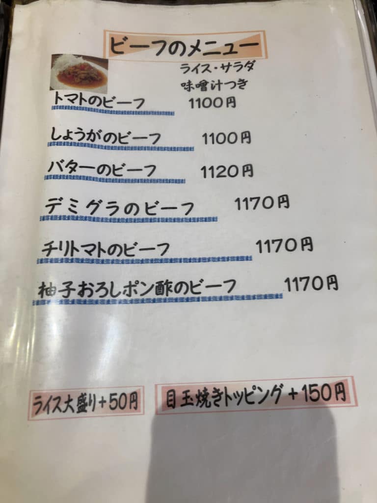 フードメニューは大きく分けて「冬季限定メニュー」「ハンバーグのメニュー」「ビーフのメニュー」「ポークのメニュー」「その他のメニュー」の5つに分かれていて、すべてのメニューにはライス・サラダ・味噌汁が付いてきます。また、ライス大盛が+50円、目玉焼きトッピングが+150円です。