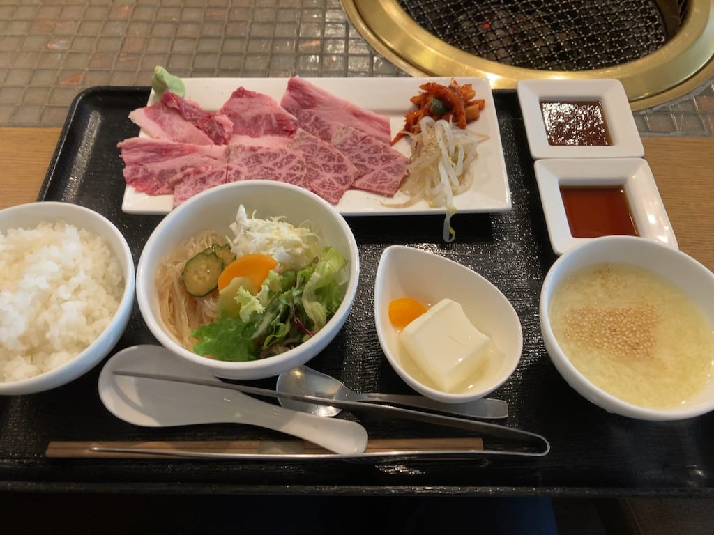 注文したのは「焼肉(A3)ランチ(モモ、バラの盛合せ)」(税込1,200円)。焼肉の皿にはキムチ、もやしナムルが添えられていて、その他に白飯、サラダ、デザートの杏仁豆腐、たまごスープが一緒についてきます。