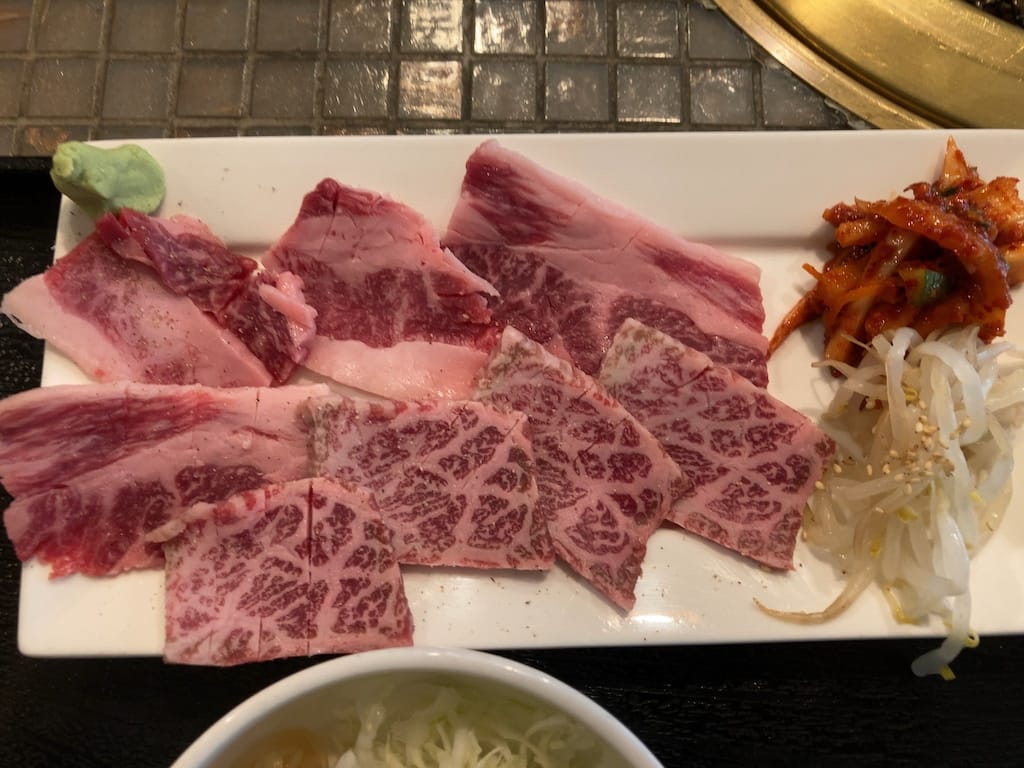 焼肉は塩コショウの面を下にして強火の場所で焼き、肉汁を閉じ込めるため何度もひっくり返すことはせず、肉の上にワサビをのせてポン酢または甘ダレで食べます。バラは多めの脂肪でコッテリした味わい、モモは赤身のコクと脂の濃厚な旨味を感じることができます。