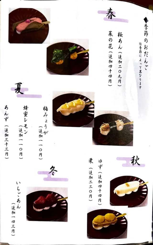 メニューはみたらしやこしあんの定番だんごから、季節限定のだんご(訪問時は冬限定のいちごあん)など、さまざまな種類の串だんごが楽しめます。だんご以外にもあんみつ、小鉢組み合わせ、しるこ、よもぎだんご、ところてん、さらには北海道産の黒豆茶と和菓子のセットなどが楽しめます。