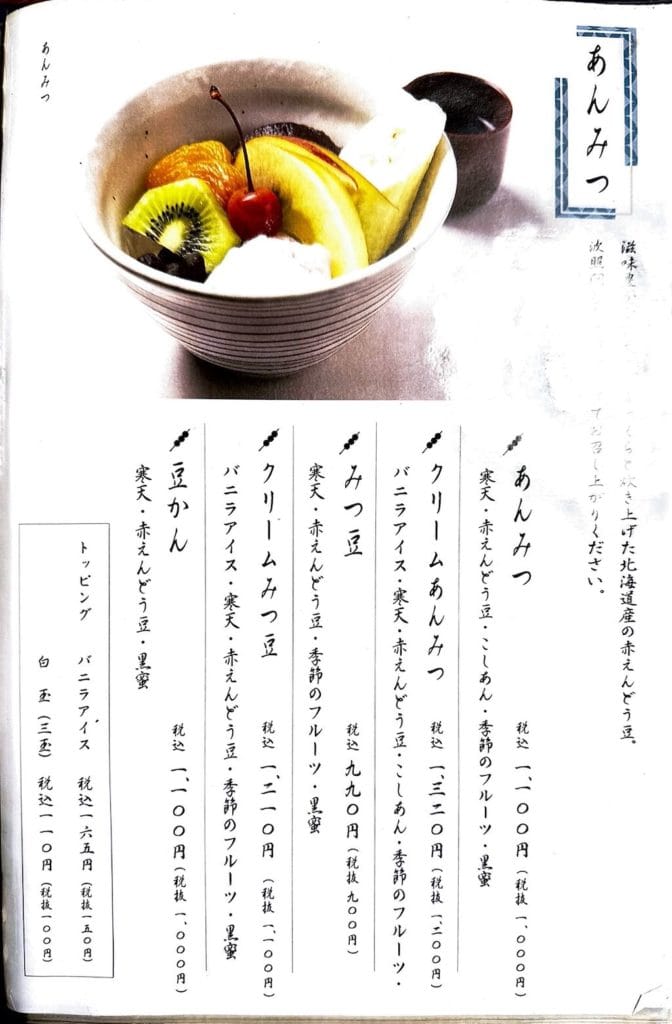 「あんみつ」は、北海道産の赤えんどう豆と波照間産の黒糖の自家製黒みつが特徴です。寒天はしっかりとした食感で、つるんと喉越しが良く、黒みつは優しい甘さで、素材の味を引き立てます。あんこは、甘さ控えめで上品な味わいです。白玉は柔らかく、もちもちとした食感で、黒蜜と相性抜群です。その他にも、リンゴ、あんず、キウイなどの季節のフルーツがトッピングされており、見た目も華やかで楽しめます。