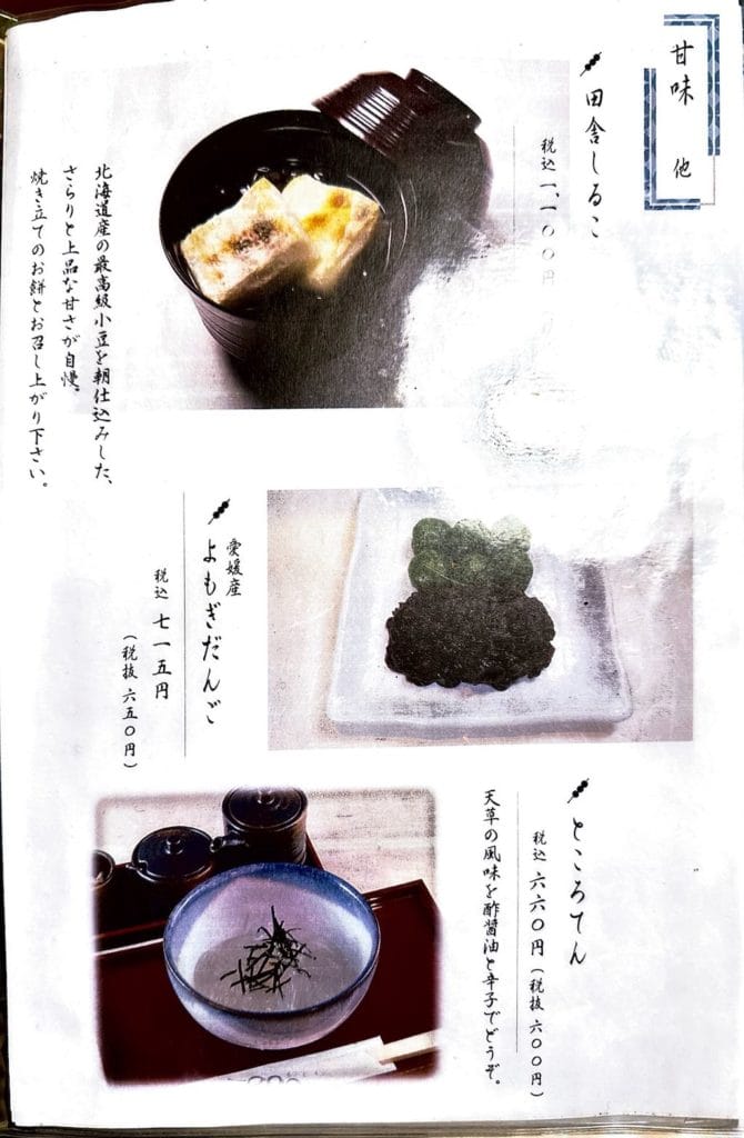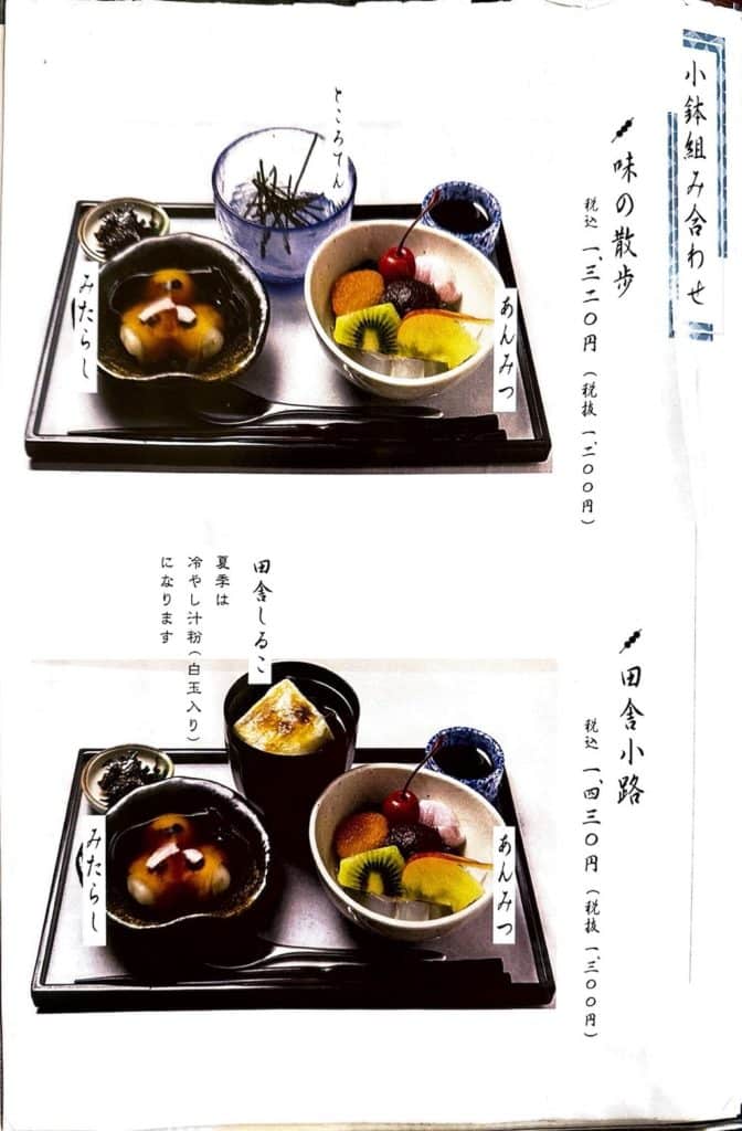 今回は小鉢組み合わせの中から「田舎小路」(税込1,430円)を注文。写真右から「みたらし」「田舎しるこ」「あんみつ」の組み合わせです。すべての小鉢が基本的に甘いので口直しにしょっぱい小鉢も付いてきます。どれも小口でいろいろな種類のメニューを味わいたい欲張りさんにはおすすめです。