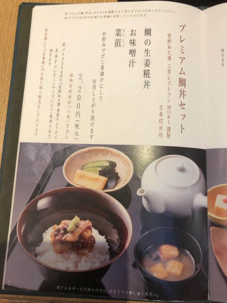 メインは「鯛の味噌胡麻丼」。鯛および白米の量は決して多くありませんが、胡麻の香ばしい風味と味噌の甘味が素材の味を引き立て、ワサビがアクセントとなり奥深い味わいを醸し出しています。