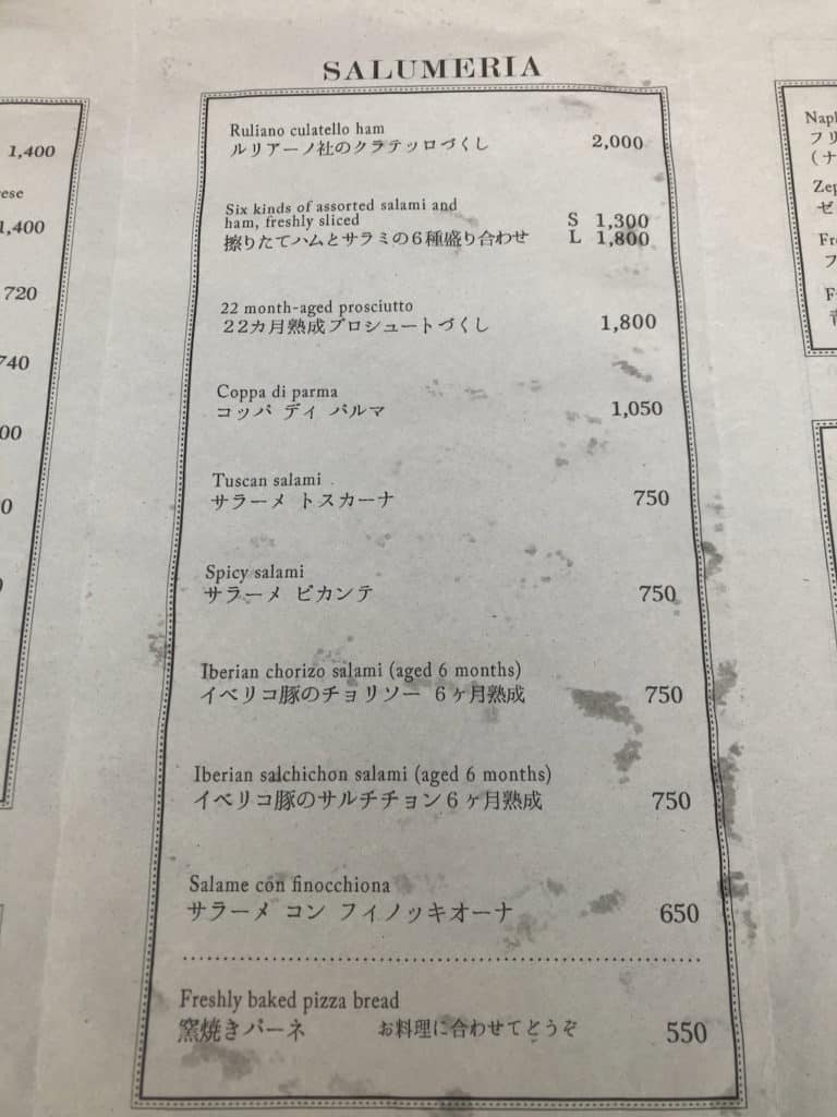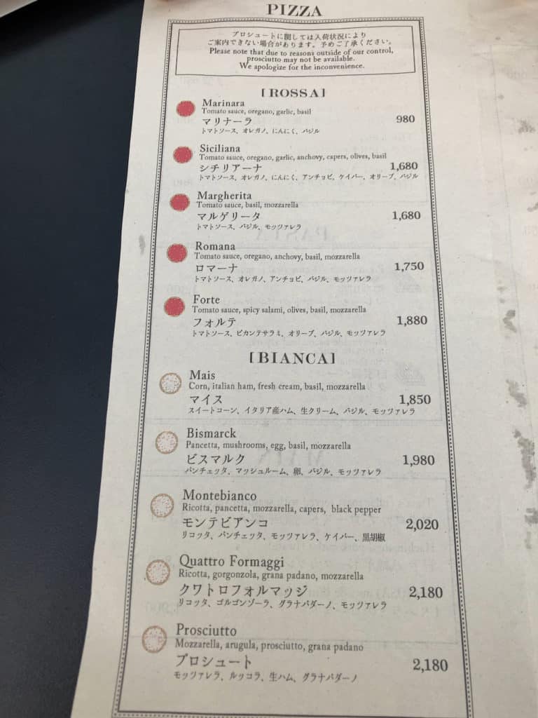 メニューの中心は石釜で焼く260gのナポリピッツァ。ROSSA(トマトベースの赤)が5種類、BIANCA(チーズベースの白)が5種類あります。それ以外にも前菜、メイン、パスタなどが用意されています。前回は定番のマルゲリータとクワトロフォルマッジを注文したので今回は別のピザを注文します。