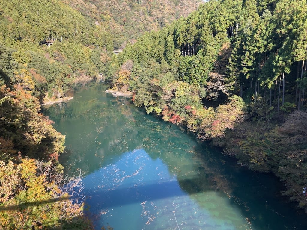 店へと続く遊歩道である橋(数馬峡橋)の上からは絶景が広がっていて、多摩川の上流にある白丸湖(白丸調整池ダム)の透き通った綺麗なブルーの水流とうっすらと始まった紅葉を眺めることができます。