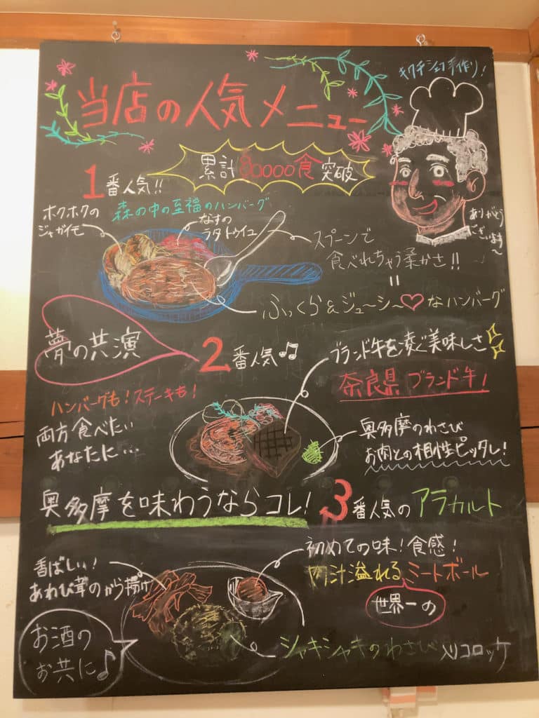 お店の1番人気は「奥多摩ハンバーグ」、2番人気は「奥多摩ハンバーグ&奈良県産ブランドA5ランクステーキ」、3番人気は「奥多摩名物アラカルト」(訪問時はミートボール、コロッケ、あわび茸のから揚げの組み合わせ)だそうです。
