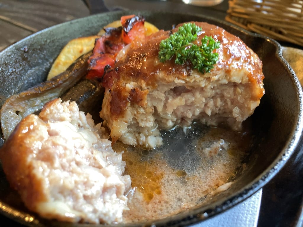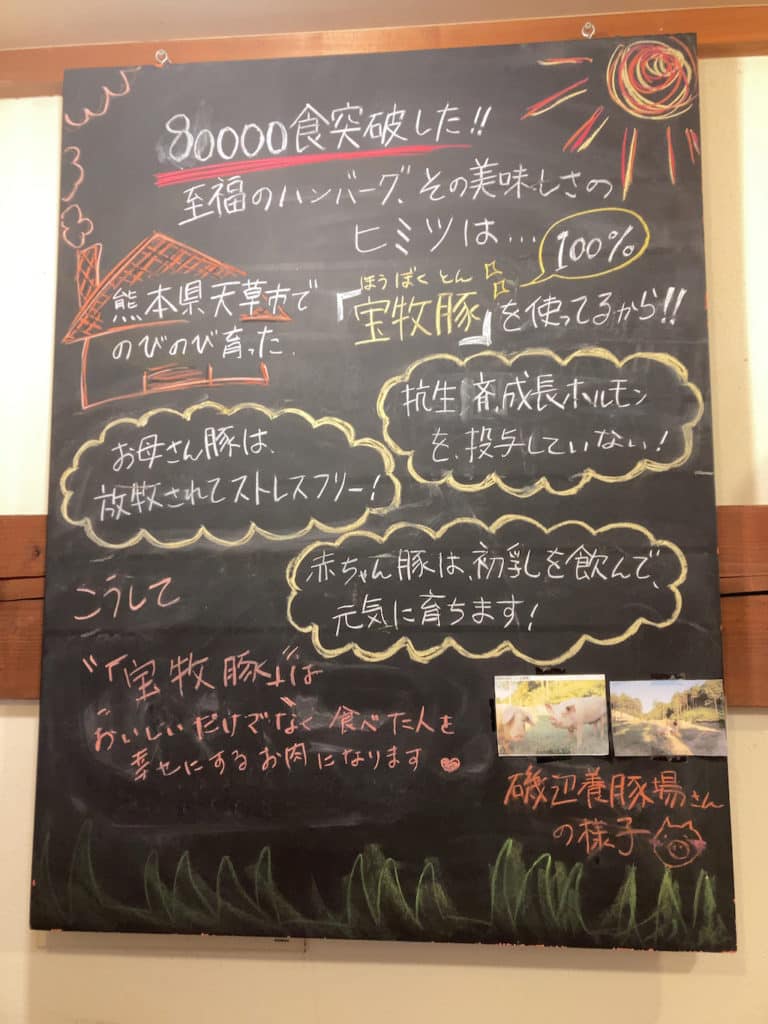 1番人気の「奥多摩ハンバーグ」、別名「森の中の至福のハンバーグ」は熊本県天草市でのびのび育った「宝牧豚(ほうぼくとん)を使っているとのことで、おいしいだけでなく食べた人を幸せにするお肉だそうです。
