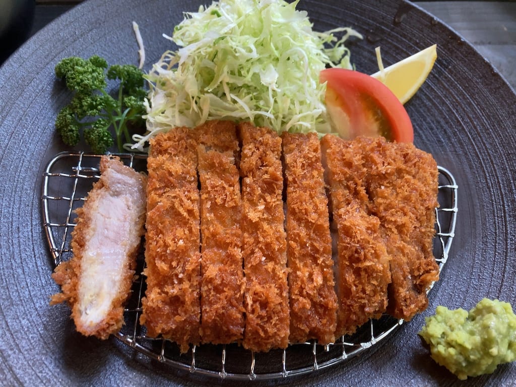 衣はサクサクで香ばしく、中身の肉は肉厚でボリューム満点ですが、脂身は少なく味はさっぱりしていてご飯がどんどん進みます。普通はカラシを付けることが多いですが、こちらは奥多摩で採れたワサビを付けて召し上がります。