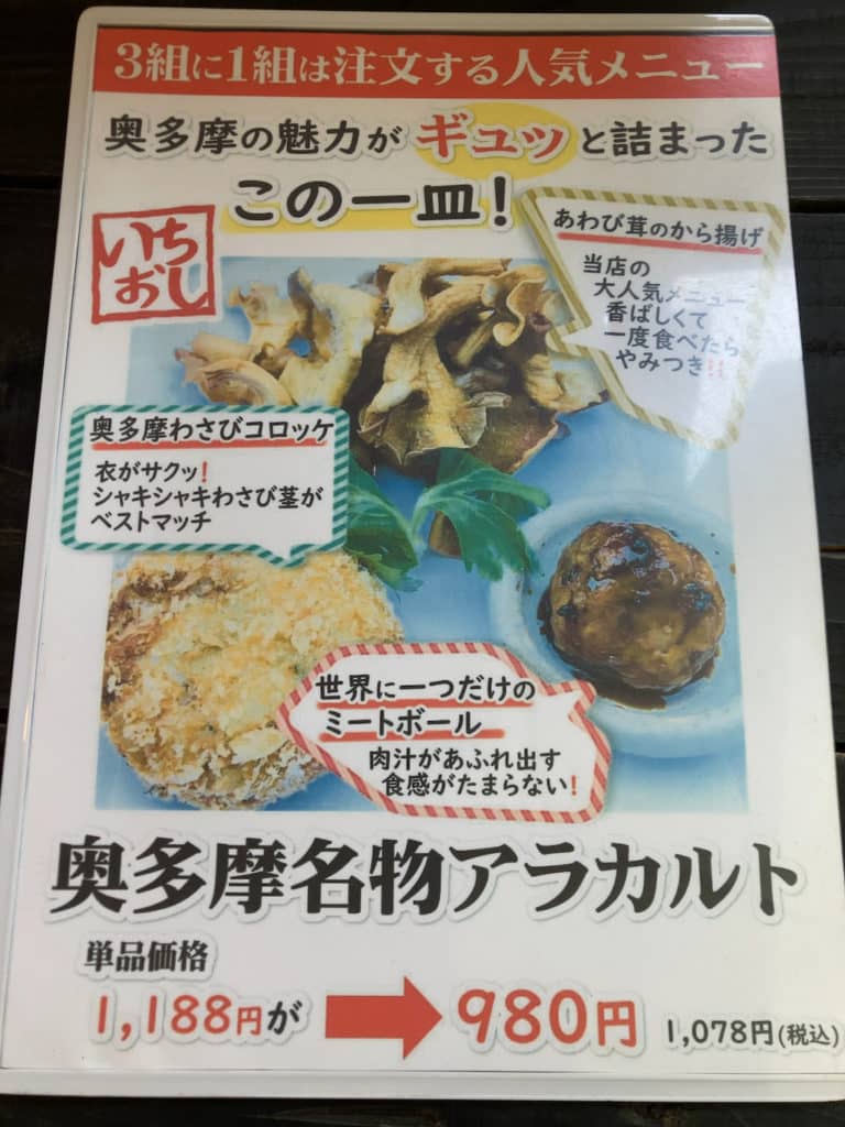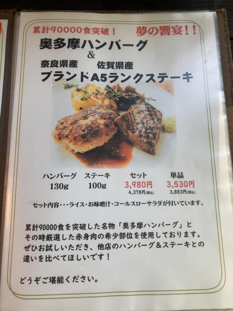お店の1番人気は「奥多摩ハンバーグ」、2番人気は「奥多摩ハンバーグ&奈良県産ブランドA5ランクステーキ」、3番人気は「奥多摩名物アラカルト」(訪問時はミートボール、コロッケ、あわび茸のから揚げの組み合わせ)だそうです。