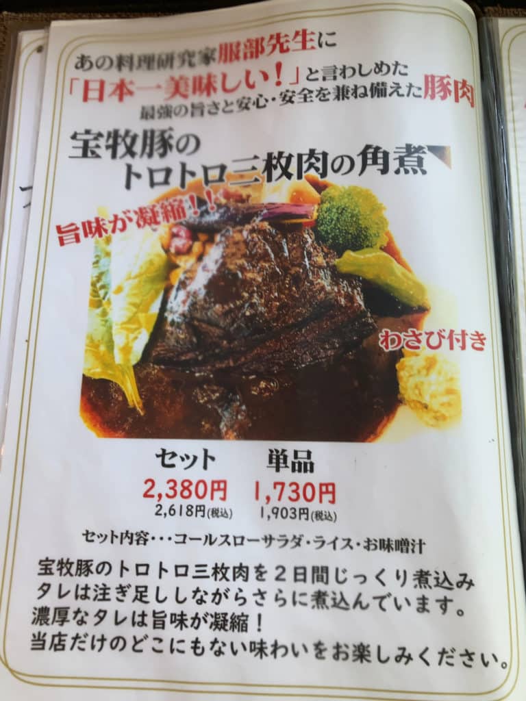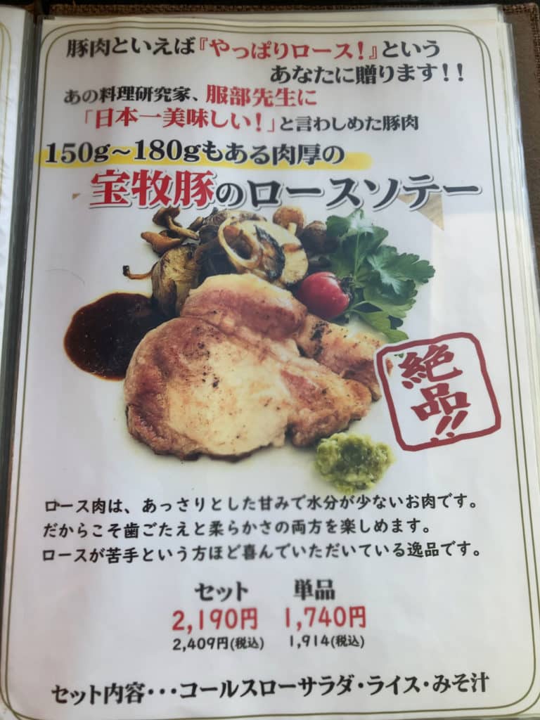 1番人気の「奥多摩ハンバーグ」、別名「森の中の至福のハンバーグ」は熊本県天草市でのびのび育った「宝牧豚(ほうぼくとん)を使っているとのことで、おいしいだけでなく食べた人を幸せにするお肉だそうです。