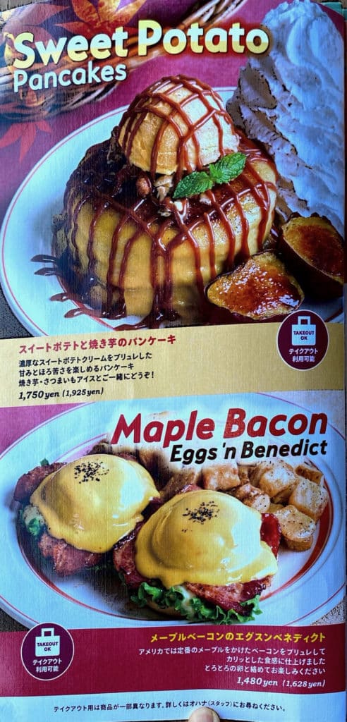 メニューの種類は多く、看板メニューのパンケーキを始めとして、ププ(おつまみ)、エッグベネディクト、ハンバーガー、ライスもの、グラノラ、フレンチトースト、ワッフル、オムレツ、サラダ、クレープなどが揃っています。期間限定の特別メニューも外せないですね。