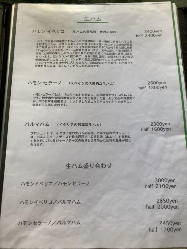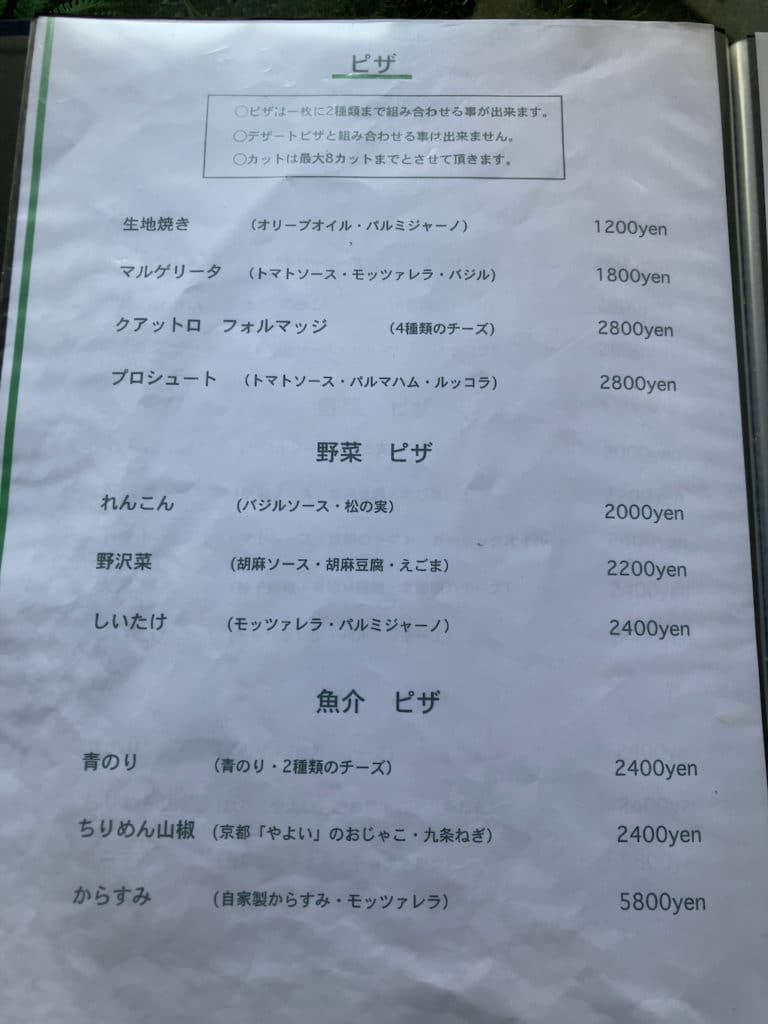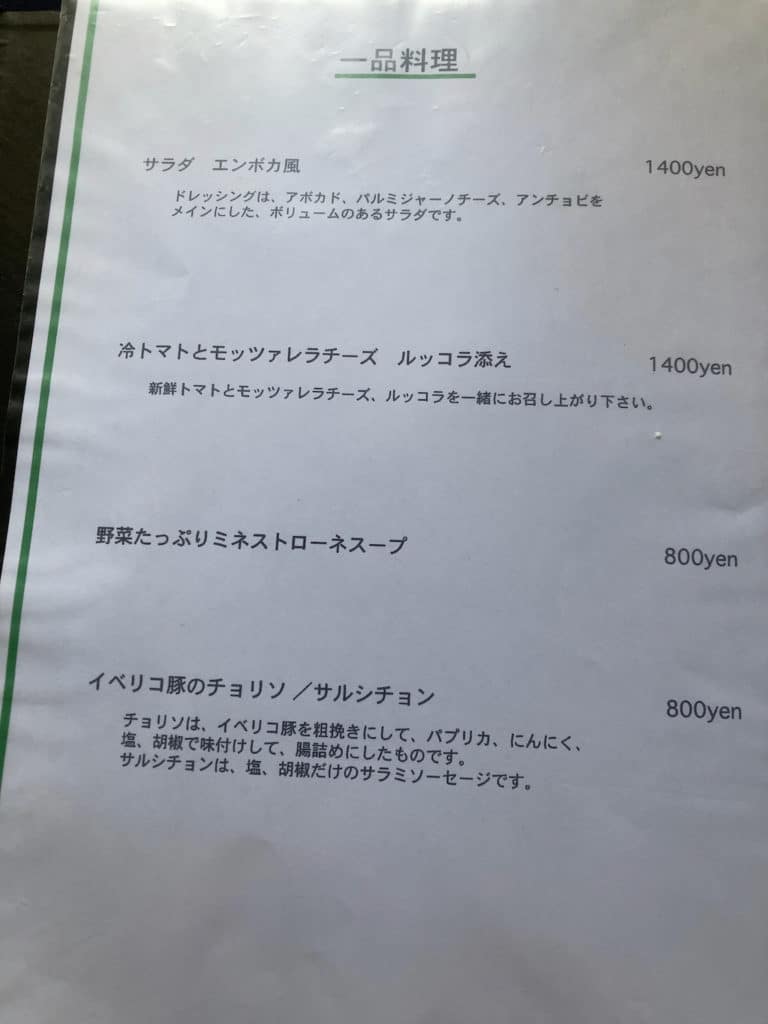 ランチメニューには大きく分けると生ハム、薪窯焼料理、一品料理、エンボカ風パスタ、ピザがあります。中でもピザが充実していてマルゲリータなどの定番メニューの他に、野菜ピザ、魚介ピザ、季節のピザ、デザートピザがあります。