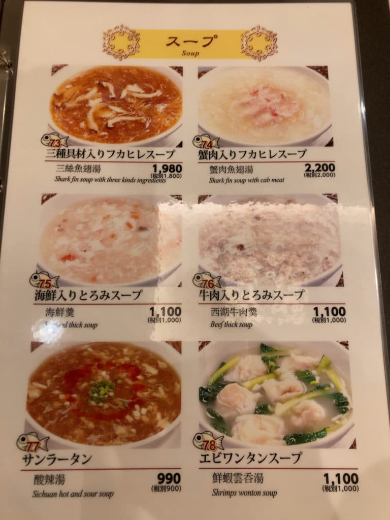 8つ目のメニューは「蟹肉入りフカヒレスープ」。とろけるようなゼラチン質で濃厚な味わいのフカヒレと、とろみの付いたスープが絡み合うおいしさが口の中でハーモニーを奏でていて、上品な風味の蟹肉が良いアクセントになっています。