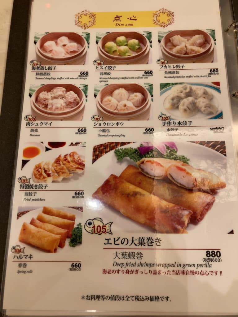 | 豪華中華コース 1. 五種前菜の盛り合わせ 2. フカヒレの姿煮 3. 伊勢海老のチリソース 4. ホタテとアスパラの炒め 5. 北京ダック 6. フカヒレ蒸し餃子 7. シュウマイ 8. 蟹肉入りフカヒレスープ 9. 海鮮あんかけチャーハン 10. 杏仁豆腐 | 12,100円 |