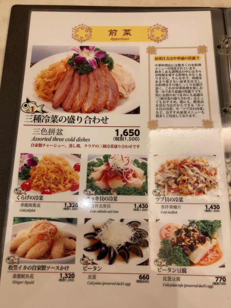 1つ目のメニューは「五種前菜の盛り合わせ」。内訳は「叉焼」「蒸し鶏」「ピータン」「鴨肉」「クラゲ」。アヒルの卵を石灰や木炭などのアルカリ性の高い物質で閉じ込めて発酵させたピータンは、独特な臭みの風味があり初めて食べましたがハマってしまいました。