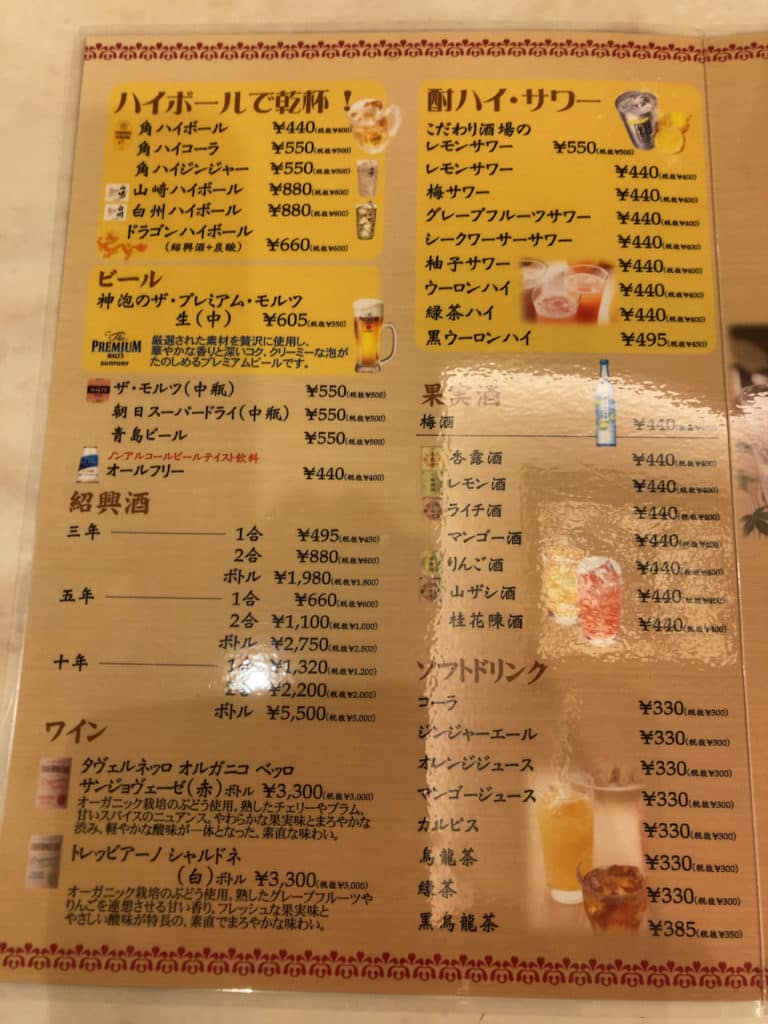 中華料理のお店ということもありドリンクメニューには紹興酒が三年、五年、十年ものと用意されています。それ以外にもビール、ハイボール、酎ハイ・サワー、ワイン、果実酒、日本酒、焼酎、ソフトドリンクなどが用意されています。