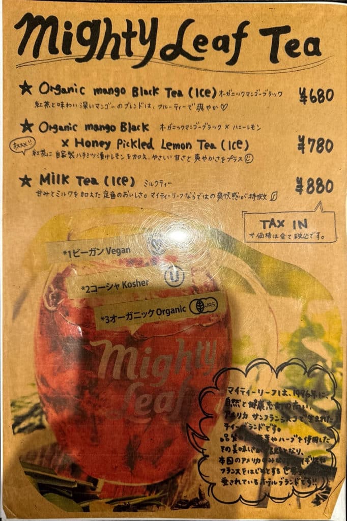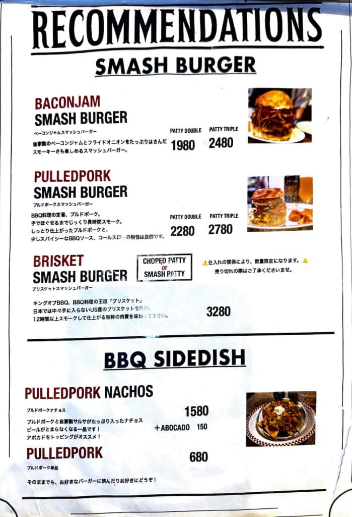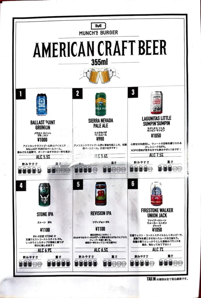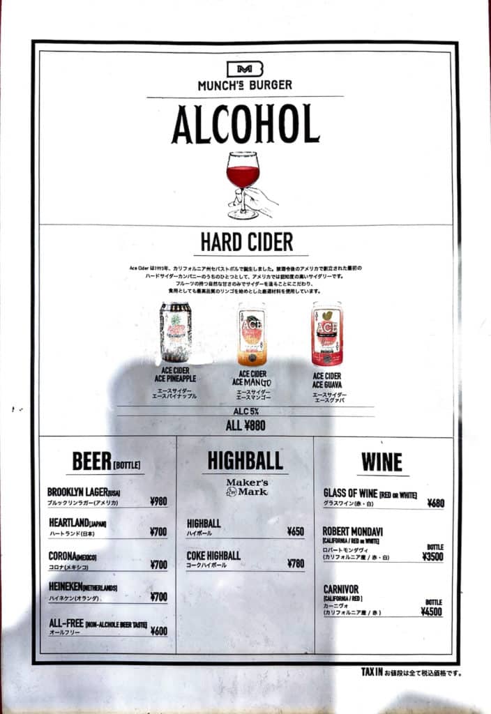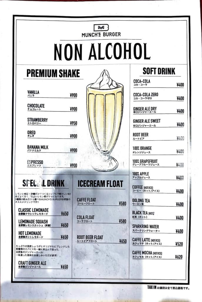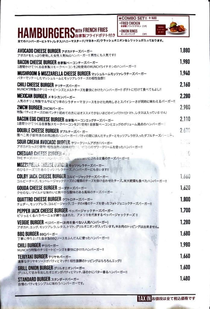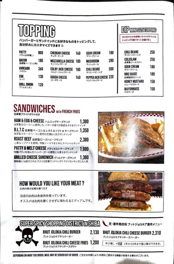 メニューは20種類以上ものハンバーガーがメインになりますが、他にも肉メニュー、サンドイッチ、サラダ、デザート等もあります。すべてのハンバーガーにトマト、レタス、ハニーマスタード、マヨネーズ、クラッシュオニオン、レリッシュが入っています。なお、テーブルチャージがない代わりに1ドリンク1オーダー制になっています。