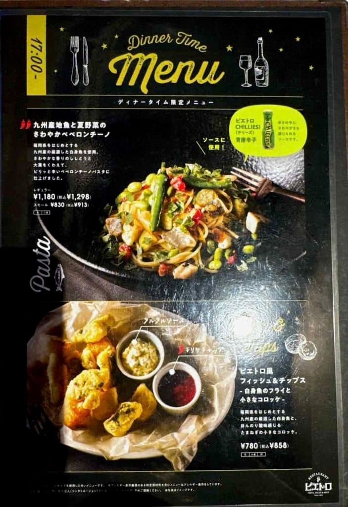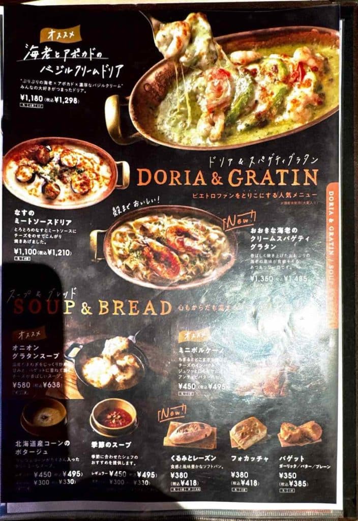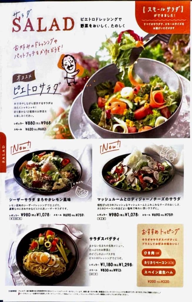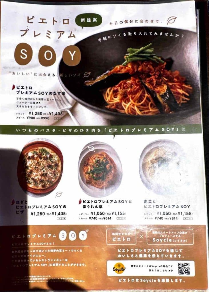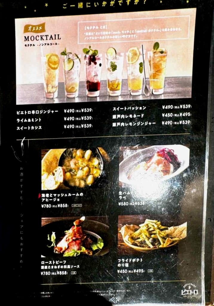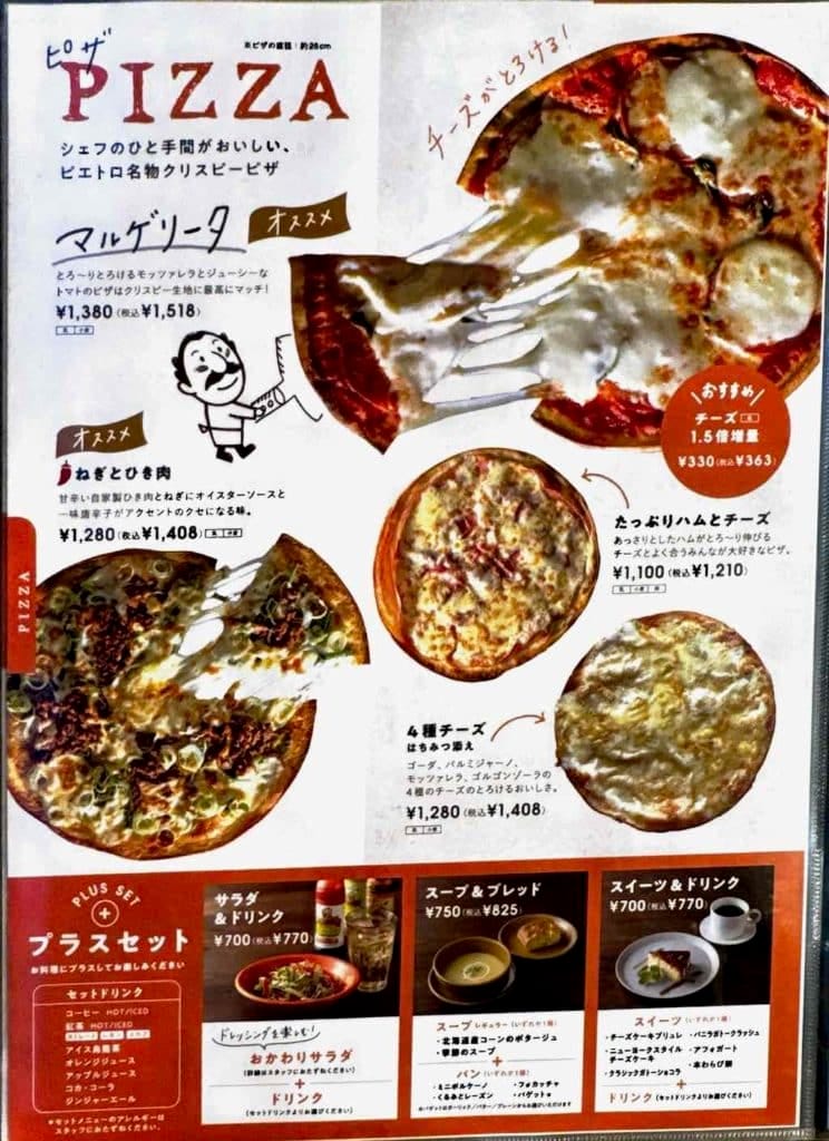 メニューは、豊富なパスタとピザが主な特徴です。「ピエトロプレミアムSOY」シリーズでは、大豆ミートを使用した健康志向のメニューが提供されています。例えば、なす辛やほうれん草とピエトロプレミアムSOYのパスタが人気です。また、サラダメニューも充実しており、ピエトロドレッシングでいただくピエトロサラダや、シーザーサラダなどがあります。さらに、ドリンクメニューには、モクテル(ノンアルコールカクテル)があり、食事と一緒に楽しめます。