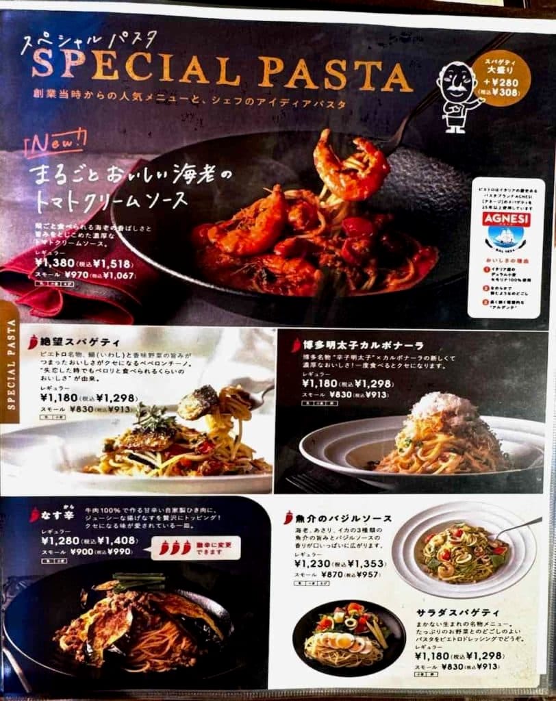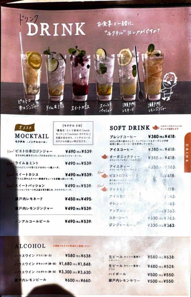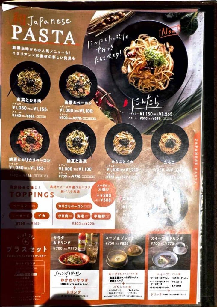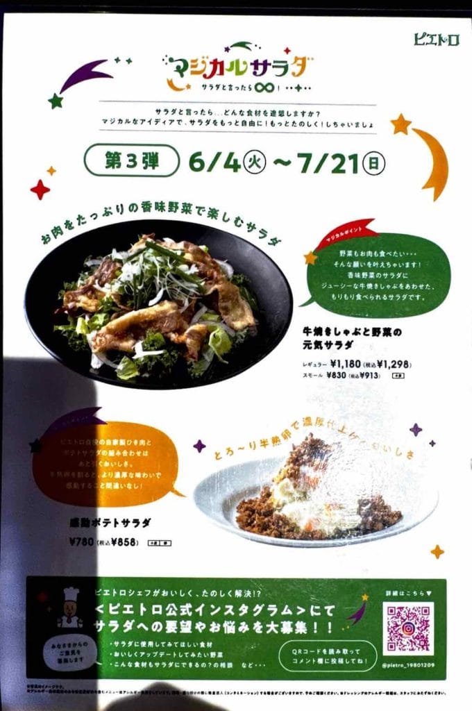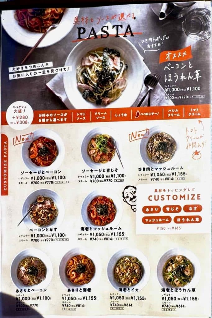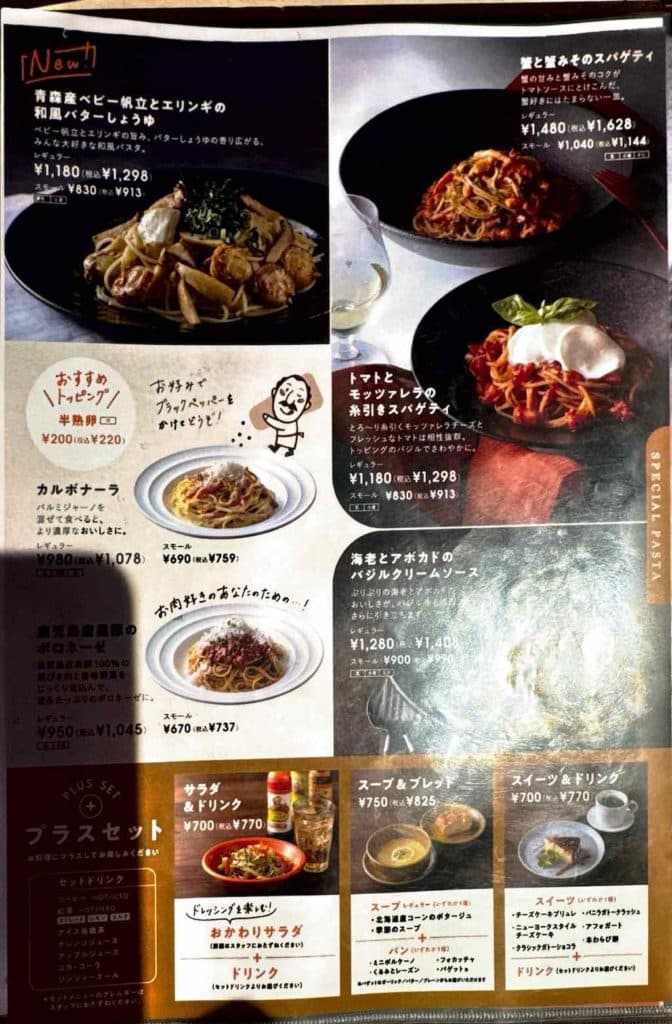 メニューは、豊富なパスタとピザが主な特徴です。「ピエトロプレミアムSOY」シリーズでは、大豆ミートを使用した健康志向のメニューが提供されています。例えば、なす辛やほうれん草とピエトロプレミアムSOYのパスタが人気です。また、サラダメニューも充実しており、ピエトロドレッシングでいただくピエトロサラダや、シーザーサラダなどがあります。さらに、ドリンクメニューには、モクテル(ノンアルコールカクテル)があり、食事と一緒に楽しめます。